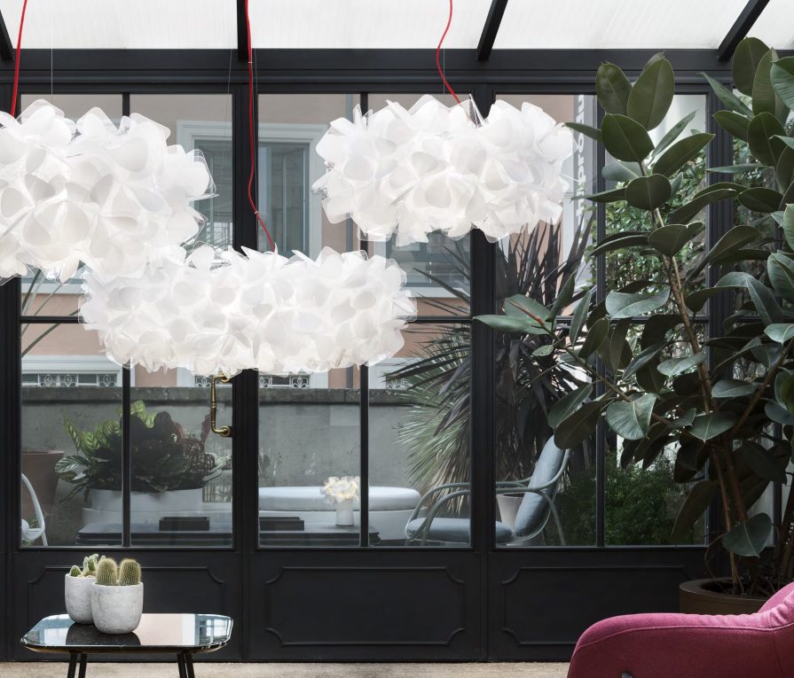 The Cl252 lamps were designed taking note of natural forms. They resemble clouds that capture the first changing rays of morning sun, or treetops filtering the play of light and shadows. Cl252 is a series of shapes fit together to create a perfect balance of reflections and transparencies. All of the available versions marry aesthetics with functionality, featuring a magnetic anchoring system, connecting them to the ceiling (for the suspensions and applique) or the metal base (for the table and floor lamps).