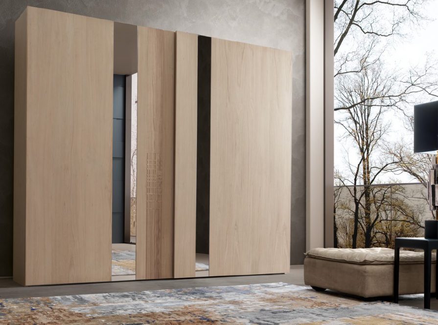 The wardrobe features sliding doors with custom front panels available in a variety of finishes, with many types of mirror.