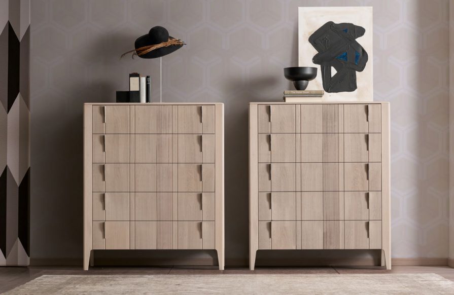 The furnishings are marked out by essential volumes, customisable through the sophisticated use of materials and colours.
