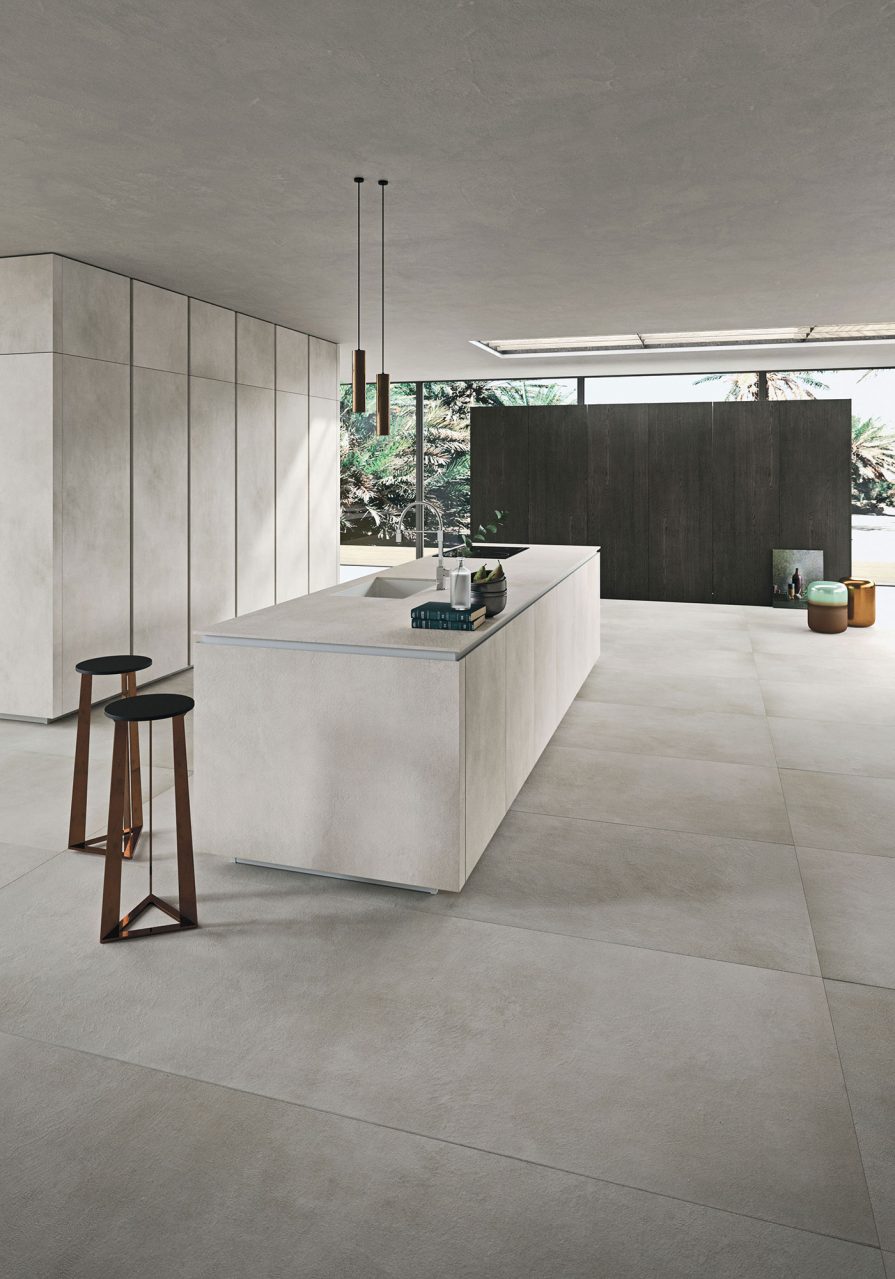 Layout with doors in Laminam lime grey ceramic and coal oak wood. Worktop in 12 mm thick lime grey ceramic. Profiles and plinth in pearl grey matte lacquer.